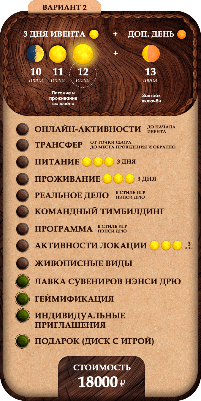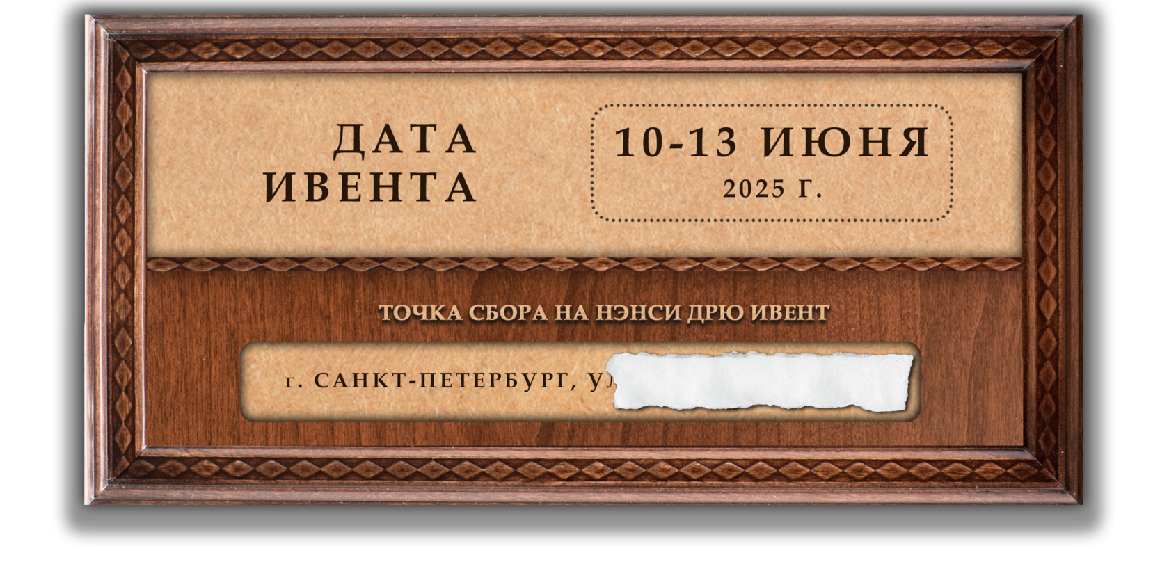 Нэнси Дрю Ивент - это как новая игра о Нэнси Дрю, со своей историей, загадками, головоломками, персонажами и делом, которое вам предстоит раскрыть. Но главное отличие, что все действия происходят в реальном мире. И в этом расследовании вы будете не одни, а с такими же фанатами Нэнси Дрю как и вы. И самое главное, что на Нэнси Дрю Ивент могут попасть люди совершенно из любого города. Формат мероприятие подразумевает несколько дней и включает в себя проживание и питание на момент проведения Ивента.